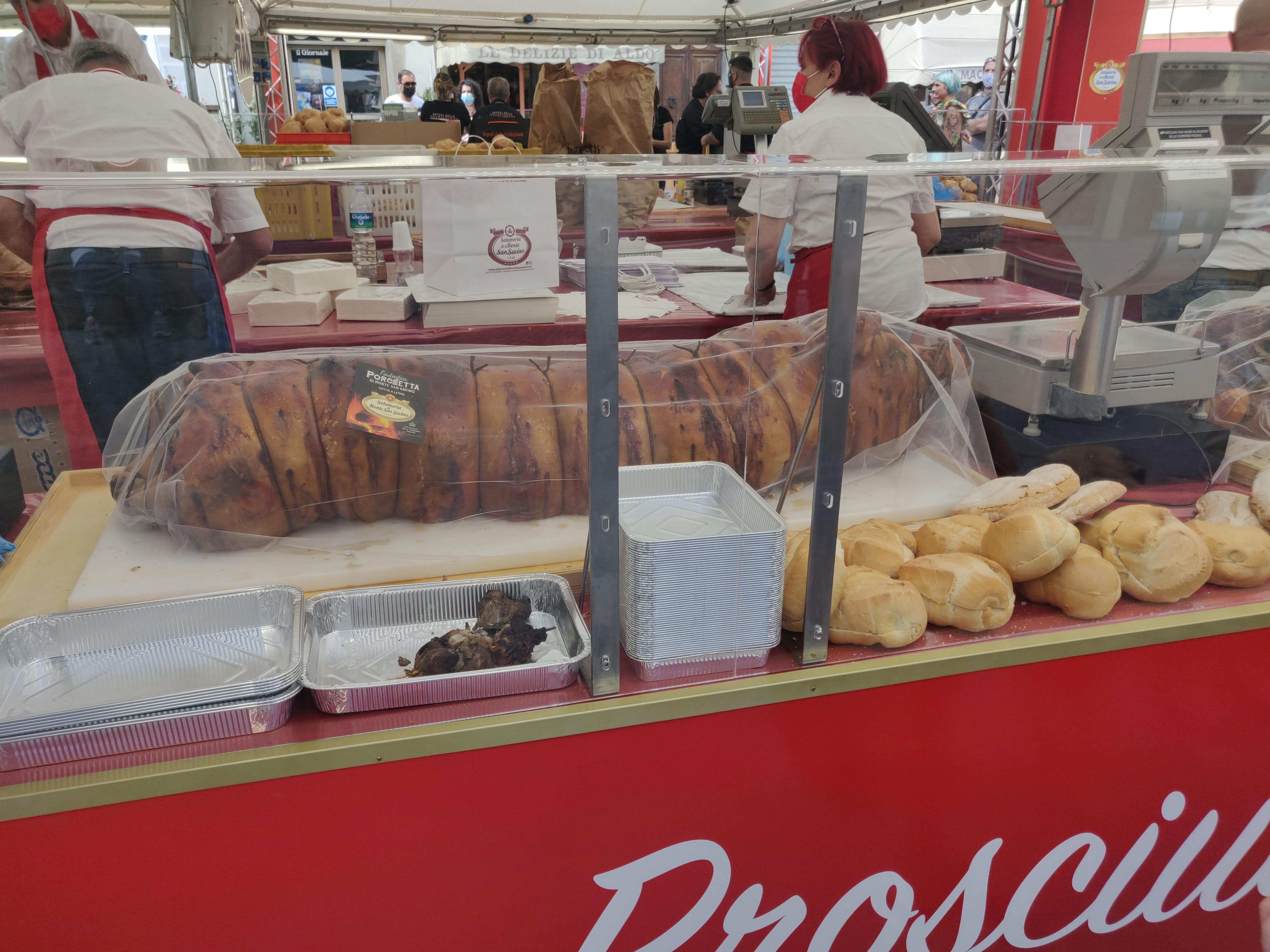 Normally would walk to town but Vicki hurt her knee mysteriously last week and we are letting it rest. We loaded into Clio and headed for town. The destination was the little coffee shop in the small plaza in the town. I had been thinking of researching sagra's this morning. Sagra's are festivals celebrating usually a local crop or food. I was happy to see as we drove into Monte San Savino that this was the Sagra Della Porchetta one of my favorite dishes. Porchetta is a savory, fatty and moist boneless pork roast. Officially it would not start until 4 today, Saturday, and all day Sunday. Parking was not a challenge yet even though the police and ambulances had all the primer spots. We walked through old walled gate into the old town. Several signs on barriers that were not in place yet, said a green card for covid was required but no one checked today. At our little corner coffee spot we found a table and sat in the sun. The couple at the other tabel was having a Spritz and we decided that was a better idea than coffee in the 80 degree temperatures. A huge tent took up the middle of the square next to the fountain and the rest of the square was covered with picnic type tables. After finishing the spritz I went over and bought way too much porchetta as they threw a extra handful after it had been weighed. Walking back to the car we left the plaza via a small very narrow street. On it was a great butcher shop that I know had three generations working in it. I was saddened to see that it was closed and had been sold.